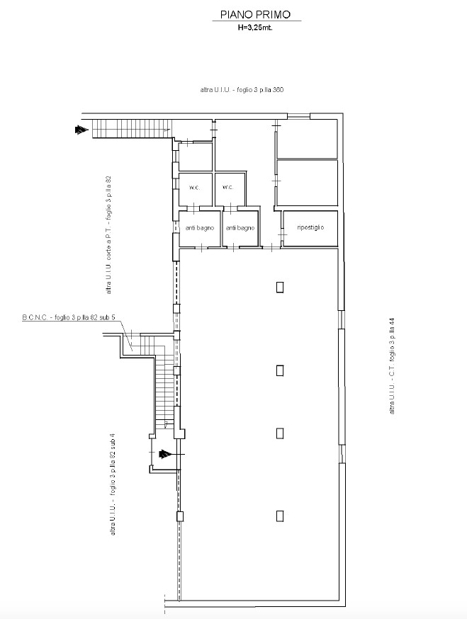 Nel Comune di Casandrino al viale Siracusa numero 16 proponiamo in vendita locale CAPANNONE C/3 LABORATORI PER ARTI E E MESTIERI collocato al piano primo di circa 320 mq adibito ad attività artigianali avente accesso da scala in ferro posta a sinistra del cortile ; il locale ha un'altezza interna di circa metri 3,25 e si compone di un unico grande locale con annessi : ambiente per il custode sala attesa, uffici , archivi, bagni con antibagni distinti per uomini e donne ed occupa in totale una superficie calpestabile di metri quadri 320